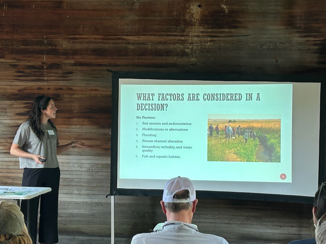 To round out the tour, Shelby Weigand with NWF, provided attendees with background about low-tech process based restoration methods, including beaver-dam analogs (BDAs). Beaver dam analogs are often installed in streams with the purpose of slowing or redirecting the flow of water. This can be useful for creating wildlife habitat (especially for fish), replenishing groundwater, and reducing sedimentation. Community members also got the opportunity to put their beaver mimicry to the test by building mock BDAs.